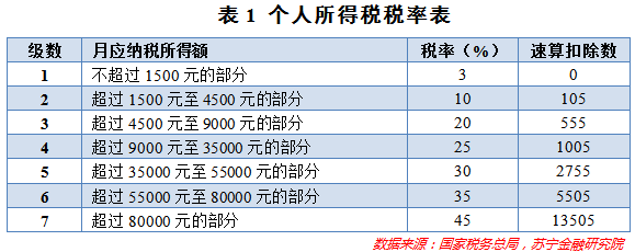 (1)税率。在个人所得税税率方面,我国实行七级超额累进税率,不同的月应纳税所得额区间对应不同的税率,税率最低一档为3%,最高一档为45%。详见表1。