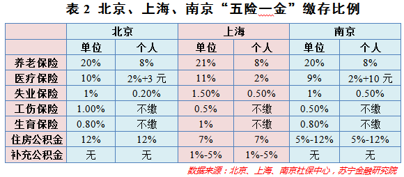 缴费比例每个城市有细微差别,缴费比例较高的是养老保险、医疗保险和住房公积金,比如,上海由于住房公积金比例较低,因此增设了补充公积金,企业和员工自愿缴纳。缴费基数是以职工本人上一年度月平均工资为基数,因地而异,因人而异。月缴存额=职工本人上一年度月平均工资×职工“五险一金”缴存比例+职工本人上一年度月平均工资×单位“五险一金”缴存比例。下表2列出了北京、上海、南京三地的“五险一金”缴存比例,供大家参考城市间的细微差别。