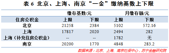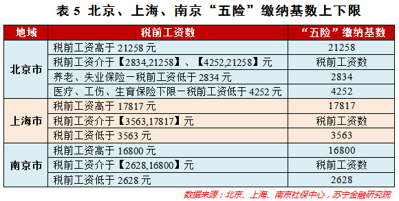 对于缴费基数,都会设有上下限,以限制“五险一金”随着工资的增长而不断增长。当工资到了一定数额时,比如20000元,你的“五险一金”缴纳金额就固定了,到达“天花板”了。此举也是为了避免高收入者由于“五险一金”的缴纳,而得到了更多的税负减免。工资高了,更多的钱将用于交税。下表5和6列出了北京、上海、南京的“五险一金”缴纳基数上下限,供参阅。
