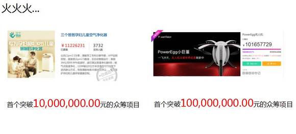 最开始的时候是做了一百多万,后来不断有新的众筹项目刷新记录,有过百万的,有过五百万的,还有过一千万的。甚至前段时间有一个无人机已经做到了一个亿。