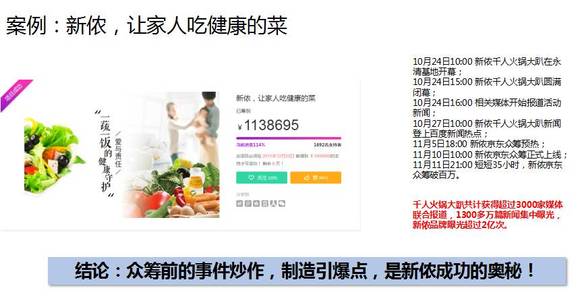 新侬的成功归结于其进行了众筹前的事件炒作,制造引爆点。它上线是11月24日上线,12月25日结束。我们可以10月24日就开始做炒作,搞了一个活动。我们看到在11月5日众筹开始预热,然后再11月10日10点的时候众筹上线,11月11日9点35个小时就破百万了。并集中超过3000家媒体联合报道,1300多万篇新闻集中曝光,新农品牌曝光超过两亿次。