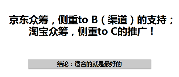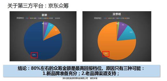 京东:收众筹总金额三个点,需要企业方发起,众筹者可以在后台操作这一块。客户群体高端人群比较多,且男性略多于女性,侧重于to B的支持。