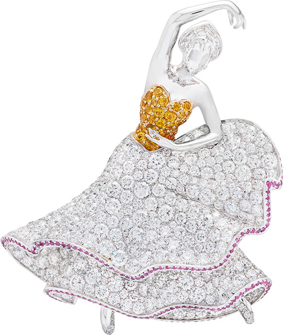 自 1940 年代以来,仙子及其他妩媚的女性便蕴藏于世家的梦幻国度中。穿 上的长裙的仙女轻盈灵动,婀娜多姿的舞步扬起层层交迭的长裙。大小各异的钻石凸显整件作品的立体感,配以粉红色蓝宝石镶边。为完美呈现芭 蕾舞伶娇俏的面容,世家以玫瑰式切割钻石打造舞伶的面部,并选用钻石头饰点缀,迷人闪亮。