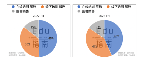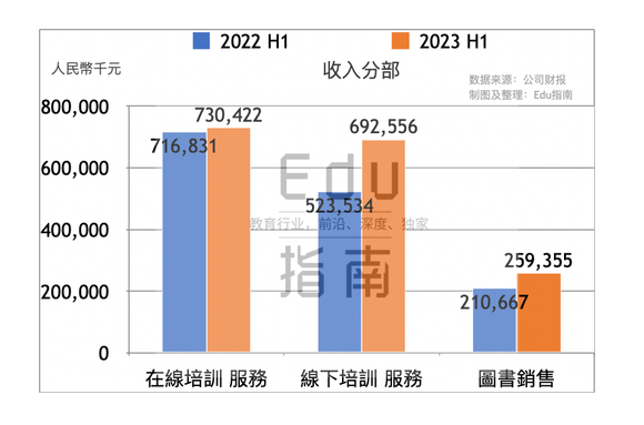 该公司收入来自在线培训服务、线下培训服务、销售图书三分部。上半年该公司三分部业务分别表现为同比增长,线下培训服务收入增幅较高。