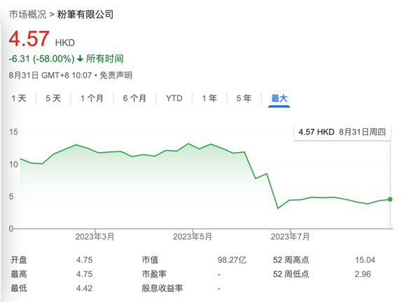 截至本文,粉笔公司股价自上市以来跌去58%,当前市值为98亿港元。
