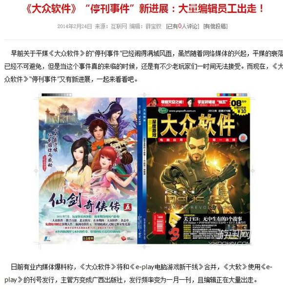 到了 2014 年,大众软件无奈和另一本叫做《 e-play电脑游戏新干线 》的刊合并发型,并且改成了一个月出一本。。。