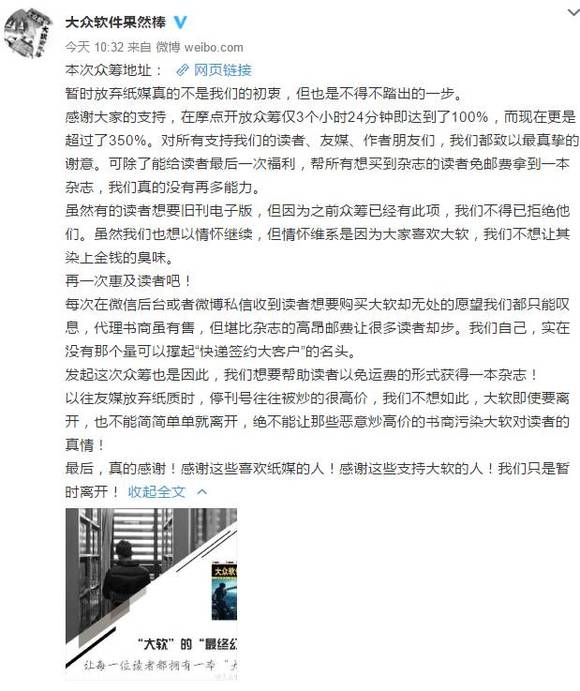 这两年大众软件多半过得不怎么好,直到今天,官方微博宣布停刊一年!