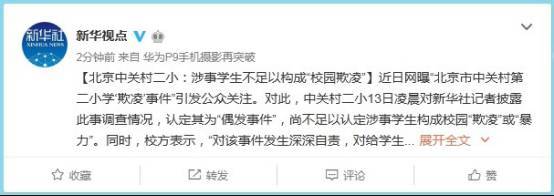 近日,北京市中关村第二小学校园霸凌事件引发公众关注。8日,一篇名为《每对母子都是生死之交,我要陪他向校园霸凌说NO!》在朋友圈流传,文章称10岁的男孩被同伴同学欺负。两名同学讲厕所垃圾篓扣到孩子头上,男孩的身心受到巨大伤害,出现了失眠、恐惧等急性应激反应。事后,经家长反映虽然两名同学承认了所作所为,但是对方家长却不以为然,拒绝道歉。