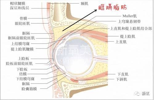 先来看一看下面这个图。是一个眼部的侧面观结构图,其他的可看可不看,重点是红字:眶隔脂肪。