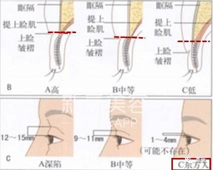 然后再来看下图,注意下图的三条红色横线的位置,C的位置最低,同步到眼睛上,就代表脂肪终止的位置更靠近我们的睫毛,也就自然眼皮会更浮肿。