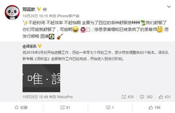 而作为吉他手讴歌,也转发微博表示这是一张不赶时间、不赶效率、不赶档期的专辑,做到乐队成员都满意了才算结束。