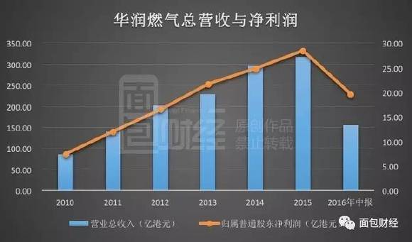 营收下滑但利润大涨很大程度上是由于居民阶梯定价实施后导致的售价与毛利上升,华润燃气是其中的典型。华润燃气在财报中明确表示:由于实施居民客户阶梯定价制度而导致燃气销售利润增长,销售毛利由29.8%增加至35.5%。下图为面包财经根据华润燃气财报绘制的其总营收与净利润变动图: