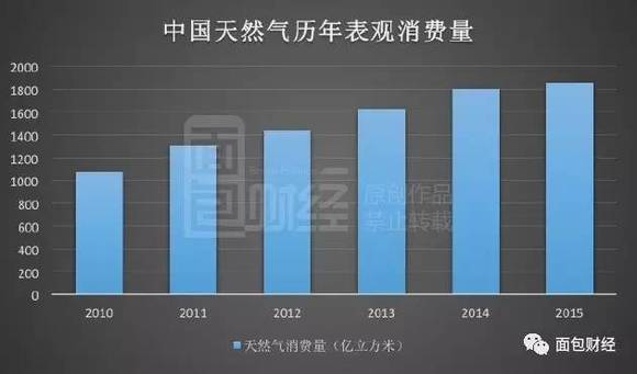 国家发改委数据显示:2015年中国天然气表观消费量为1857.61亿立方米,同比增速仅为2.77%;远低于2014年10.78%的增速。今年上半年增速也只有9.8%,仍然没有达到预期。下图为面包财经根据国家发改委数据绘制的中国天然气历年表观消费量: