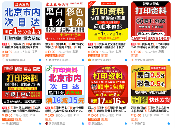在需求并不迫切之时,部分大学生选择在网上进行大量打印任务,如打印教材、复习资料等。没有了校区周围高租金的限制,线上文印价格以分来计算。选择当地线上文印,甚至可以享受到次日达服务。部分线上商家看准商机,通过公众号等形式,免费发放考研、四六级等资料,对大学生精准引流,北京某企业仅在淘宝上销量就有 100 万+。