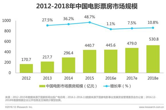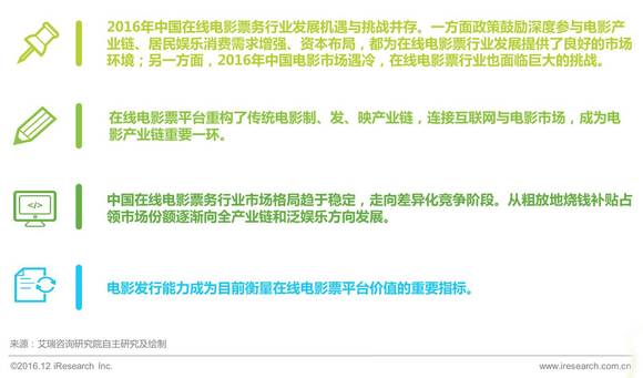 艾瑞分析预计2016年中国电影票房与2015年持平,中国电影市场进入冷静期。电影市场增速放缓,影响在线电影票平台快速发展。