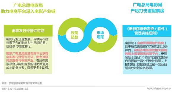 一方面,政策鼓励“互联网+电影”。广电总局电影局颁发给电商平台电影发行经营许可证,给予电商平台深入参与电影产业的资格。另一方面,加强对市场的监管和规范。针对电影市场假票房购买现象,成立全国电影市场专项治理办公室,对全国票房进行监管。同时,颁布影院票务系统实施细则,要求每张电影票原始信息报至国家数据平台,并对违规行为进行实时通报。