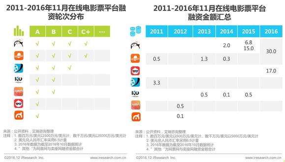 2015年以来,腾讯、阿里等资本巨鳄先后布局在线电影票务。其中,2016年微影时代C+轮获投30亿元,为业内最大额度单轮融资;淘宝电影A轮融资17亿元,估值高达137亿元。在线电影票务成互联网热门行业。