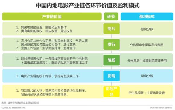 电影产业链各环节负责电影从制作到上映的不同工作,环环相扣,业务衔接紧密,且盈利模式基于票房,利益共享。