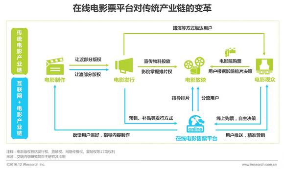 在线电影票平台从售票环节切入电影市场,对传统产业链进行了变革。线上购票改变了用户的消费习惯,用户的决策从电影院转移到线上,电影内容制作和宣发也逐渐依赖于互联网沉淀的大数据,在线电影票平台成为电影产业链重要环节。