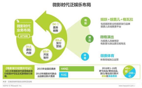 2015年微影时代收购格瓦拉,与旗下票务平台娱票儿资源共享,双品牌独立运营。其中,娱票儿定位为泛娱乐票务平台,重消费属性;格瓦拉定位为都市娱乐消费指南,重社交属性。