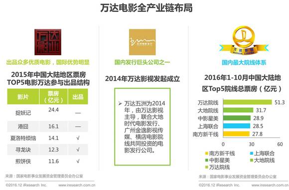 万达影视、万达五洲、万达院线已形成“制片”、“发行”、“放映”的完整产业链,并在产业链各环节表现亮眼。万达影业掌握中国大陆地区最大的院线体系,且在2015年并购美国第二大院线AMC,这一举使得中国电影在美国乃至全球拥有了更多国际参与度,也是万达在电影行业全球话语权提升的表现。