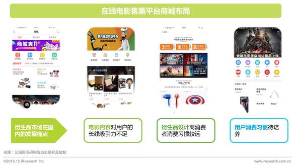 衍生品市场是围绕电影内容的再开发,在国外市场结构中占有重要的分量。但在国内始终发展不温不火,这与国内市场用户消费习惯有一定关系。目前各大在线售票平台均布局衍生品商城,有的甚至渗透到下游衍生品设计制作。随着在线售票平台的供给刺激,或将给衍生品市场带来新的发展刺激。
