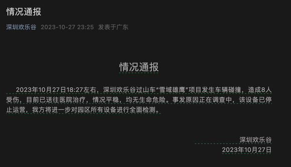 随后,晚上23点25分深圳欢乐谷发布情况通报称,2023年10月27日18:27左右,深圳欢乐谷过山车“雪域雄鹰”项目发生车辆碰撞,造成8人受伤,目前已送往医院治疗,情况平稳,均无生命危险。事发原因正在调查中,该设备已停止运营,欢乐谷方将进一步对园区所有设备进行全面检测。