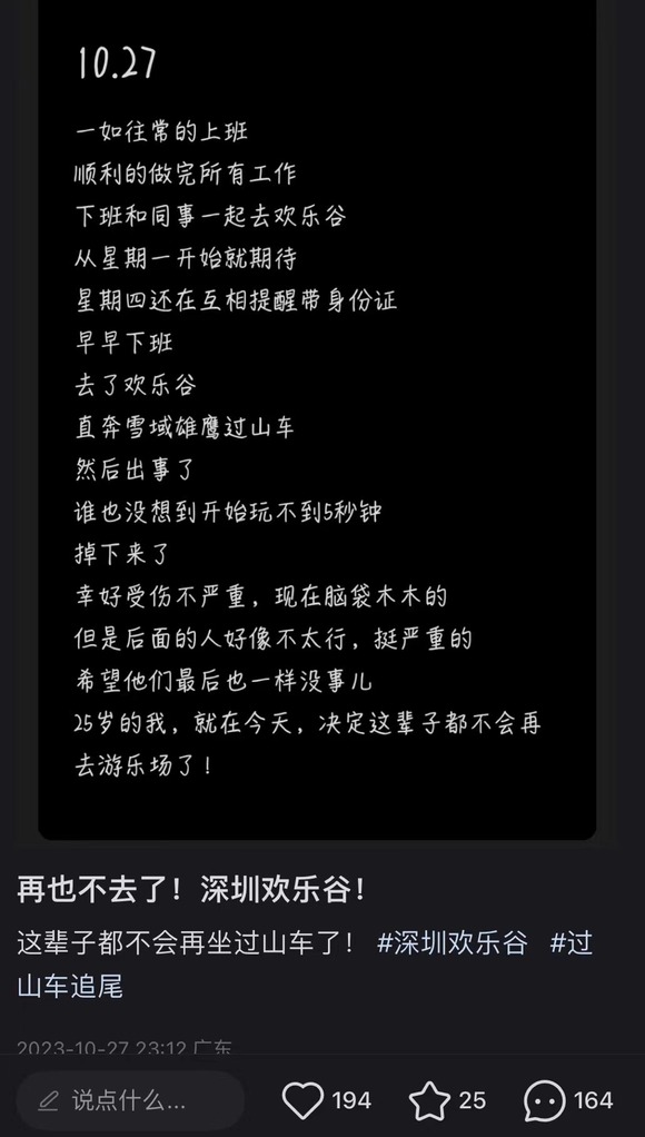 也有自称为事故亲历者在社交平台发帖描述当时的情况:“没想到开始玩(雪域雄鹰)不到5秒钟就掉下来了,幸好受伤不严重。但是后面的人好像挺严重的。”