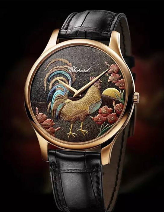 再比如萧邦,也是非常不计成本在做生肖主题,从马年开始就使用日本古老的莳绘工艺制作生肖的表盘,今年联合了山田平安堂(Yamada Heiando,日本皇室御用漆器制造商),由日本国宝级漆艺大师增村纪一郎(Kiichiro Masumura)担任设计并指导所有表盘的制作,漆艺大师小泉三教(Minori Koizumi)亲手绘制。