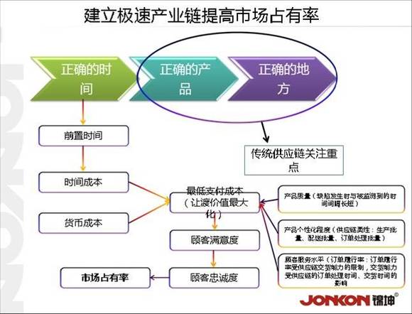 说白了,构建极速供应链最终的目的之一是扩大企业的市场占有率,如果不是为了这个目的,哪个企业肯花这么大的血本去构建这个价格高昂又复杂的供应链系统。在消费市场中顾客对一个品牌的忠诚度是决定这个品牌市场占有率有重要的指标之一,而这个忠诚度恰恰是消费者每一次消费过程中的满意度所决定的。传统企业往往会把自己的注意力集中在如何实现把正确的产品送到正确的地方,而极速供应链模式下的企业则更多的关注了怎样在正确的时间把正确的产品送到正确的地点。这个所谓的正确时间就是指消费者在需要某种东西的时候正好能买到,在消费过程中,消费者支出的不只只是人民币,时间成本也是消费者支付成本之一。而产品的质量、产品的个性化程度以及服务水平都是消费者在消费过程中所获得的满足感也就是价值,当消费者能以最低的成本获得最高的价值和满意度,那么消费者肯定对这个品牌忠贞不二,市场占有率自然就上去了。