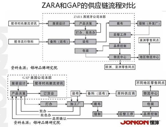 当ZARA成功运作极速供应链把曾经的服装连锁业的老大GAP挤下王座的时候,我们应该要知道ZARA究竟是哪些环节上领先一步。
