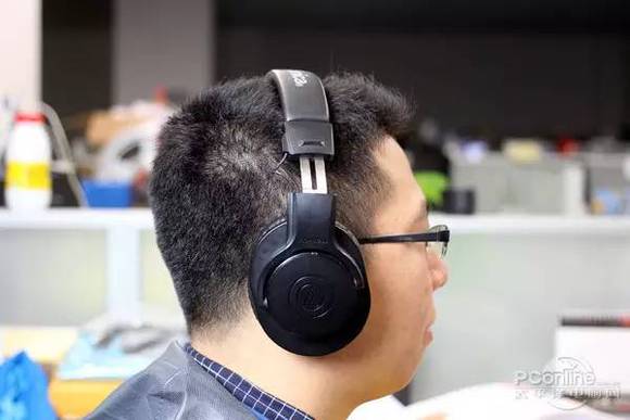 铁三角ATH-M20X在借由较大的尺寸和轻量化的塑料材质,在佩戴时重量感最轻。较为宽厚的耳罩也带来了较小的额耳压,并兼具着不错头部贴合感。比较明显的问题是偏厚的耳罩内部空间有限,可能对某些耳型稍大用户来讲会发生压耳情况。
