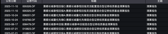 11月11日,景顺长城发布了旗下迷你基——景顺长城泰祥回报混合的清算公告。这是一只偏债类基金,2020年11月23日成立,成立初期规模为2.23亿元,2021年底该基金的规模达到了顶峰为8.96亿元,之后开始一路下降。截至今年9月末,景顺长城泰祥回报混合的期末净资产为0.02亿元。