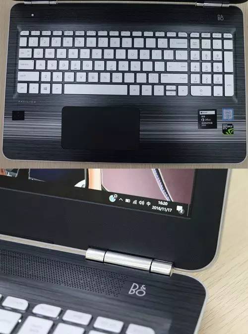 光影精灵C面为黑色木纹纹理设计,采用的是内漾印技术,工艺程度较高,不易褪色脱落。空格按键下面则为一体式触摸板,相对于其他品牌触摸板设计来说,较长些,这样子的设计方便使用的时候滑动面积较大。键盘右上角有个丹麦B&O音效标识,所以光影精灵外放效果也是相当不错的。