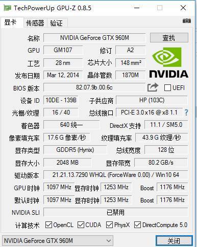 GTX960M 2G独显采用GM109核心 麦克斯韦架构 640流处理器 位宽为128Bit GDDR5显存类型,海力士显存颗粒 频率为1097MHz
