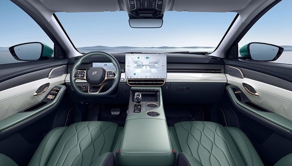 内饰环抱式横向设计,配备全液晶仪表盘和15.6英寸中控屏,内饰有春绿和墨黑两种配色。车机系统搭载高通骁龙8155芯片,配备L2级智能辅助驾驶系统。动力方面,山海L9采用鲲鹏超能混动C-DM技术,1.5TGDI混动专用发动机最大功率155马力,峰值扭矩220Nm,双电机最大功率268马力,系统最高综合功率424马力。搭载国轩高科三元锂电池组,纯电续航108km,综合续航1100km。