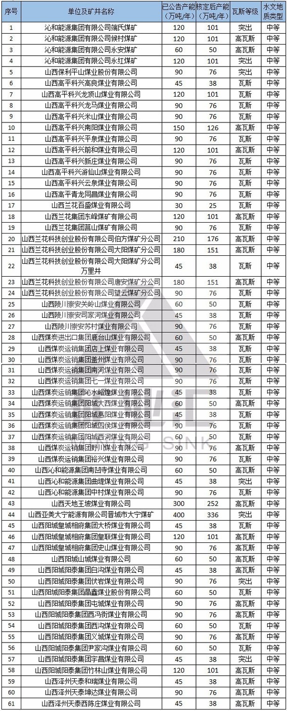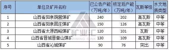 截止2016年3月31日,山西重新核定产能后共有煤矿562座,公告产能90925万吨/年,重新核定产能76377万吨/年。其中国有重点煤炭企业175座,公告产能38155万吨/年,重新核定产能32050万吨/年;地方煤炭企业387座,公告产能52770万吨/年,重新核定产能44327万吨/年。