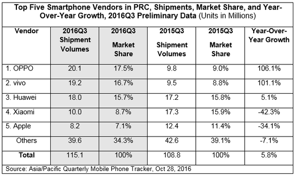 2016年,OV蓝绿双厂在国内手机市场获得巨大突破。IDC数据显示,今年第三季度,OPPO和vivo在中国市场的出货量分别达到了2010万部和1920万部,双双超越华为,成为中国市场冠亚军。其中,OPPO出货量达到小米两倍。