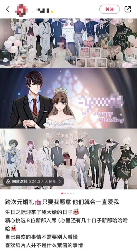 除了给虚拟CP办婚礼,还有乙女游戏(一种以女性群体为目标受众的恋爱模拟类游戏)的玩家,给自己和钟爱的纸片人们举办婚礼的,而且还能同时嫁给8个纸片人。