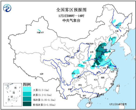 中央气象台预计,2日早晨到上午,北京东南部、天津、河北东部和中南部、河南中东部、山东中西部、安徽北部、江苏、陕西中南部、四川盆地中西部等地有大雾,其中,北京东南部、天津、河北中南部、河南中东部、山东西部、江苏中部等地的部分地区有能见度低于500米的浓雾,局地有能见度低于50米的特强浓雾。