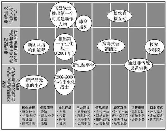 乐高创新矩阵是新管理层团队制定的又一大重要战略,这个矩阵揭示了乐高如何基于现有的产品体系和作业流程,做延展性创新或颠覆式创新。