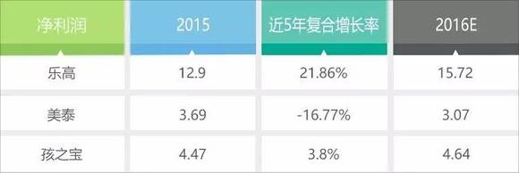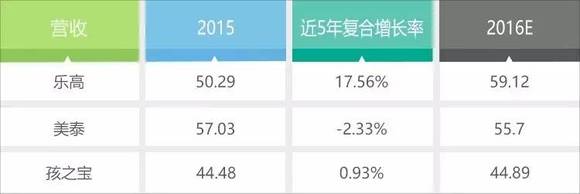 接下来我们看看乐高与另外两家玩具行业领头羊(美泰和孩之宝)的对比情况,我们使用这三家公司最近5年的复合增长率来预测他们2016年的财务状况。