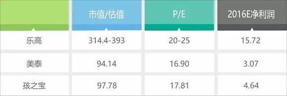 按照美泰和孩之宝目前17x和18x的P/E,综合我们刚刚计算得出的两家在2016年的净利润,可以发现两家公司的市值都被高估。