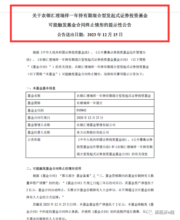 就可能触发基金合同终止的情形,农银汇理瑞祥一年持有在当天的公告中提示,根据《基金合同》“第五部分基金备案”之“三、基金存续期内的基金份额持有人数量和资产规模”的约定:“《基金合同》生效之日起三年后的对应日,若基金资产净值低于2亿元,基金合同自动终止,无需召开基金份额持有人大会审议,且不得通过召开基金份额持有人大会的方式延续。”