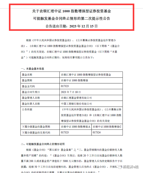 12月15日,农银汇理基金旗下农银中证1000指数增强发布第二次提示性公告称,该基金可能触发基金合同终止情形。