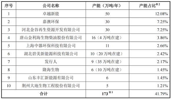 若按产能统计,我国生物柴油市场集中度相对较高,前十大(含并列)生物柴油企业占比超过40%。截至2022年底,丰倍生物以9万吨/年的产能占比2.17%,卓越新能2022年的产能为50万吨/年,占比12.08%。此外,嘉澳环保、河北金谷再生资源开发有限公司产能均为30万吨/年,远高于丰倍生物。