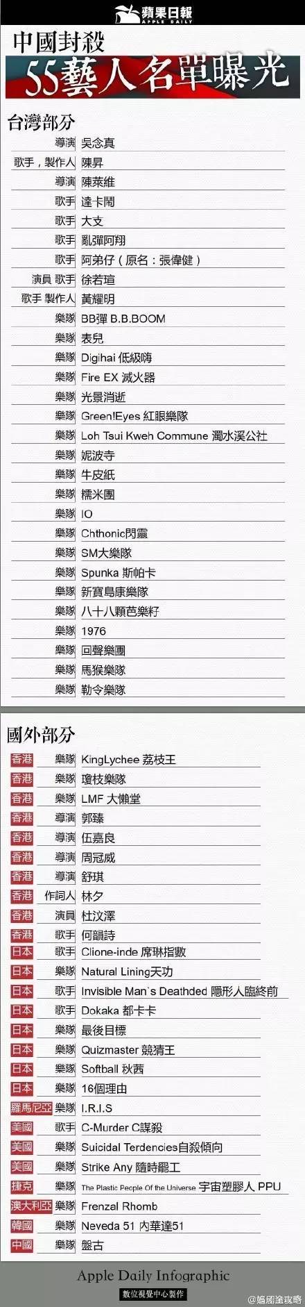 根据《苹果日报》的说法,包括陈升、黄耀明和徐若瑄等55名和台独、港独等有暧昧关系的艺人遭到内地封杀。波及台湾、香港、日本、澳大利亚等多国音乐人,涉及国家范围之广前所未有。