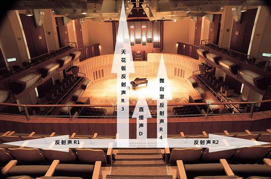 第四,舞台罩反射声R4。舞台上的声音传向舞台罩,再经舞台罩反射后转传向听众的反射声。