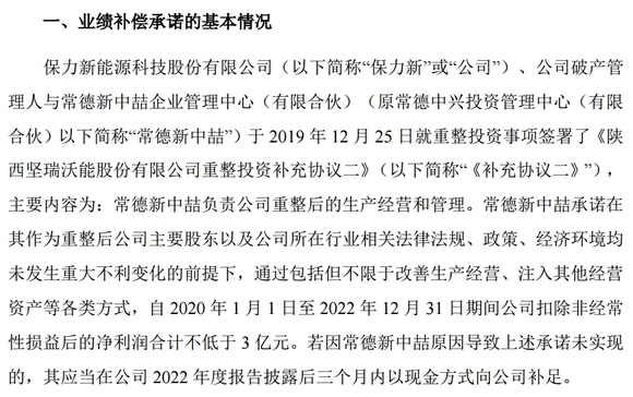 2019年底进入破产重整的保力新(曾用名坚瑞沃能)以战投身份引入常德新中喆作为控股股东。彼时,后者作为业绩承诺方承诺:保力新需在2020年至2022年三年间实现扣非净利润不低于3亿元。根据公司近三年的业绩,上市公司认为,公司扣除非经常性损益后的净利润为-5.28亿元,由此,常德新中喆应补偿公司8.28亿元。