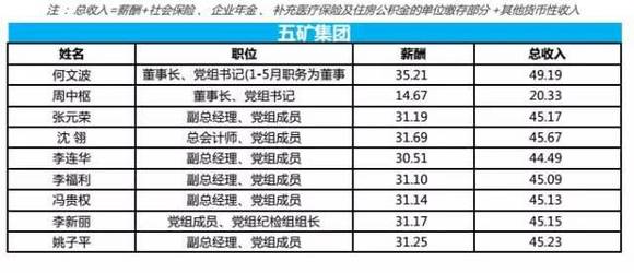 五矿集团2015年新任董事长何文波薪酬最高,达到35.21万元,社会保险、企业年金、住房公积金等其他收入13.982万元,合计总收入49.192万元。